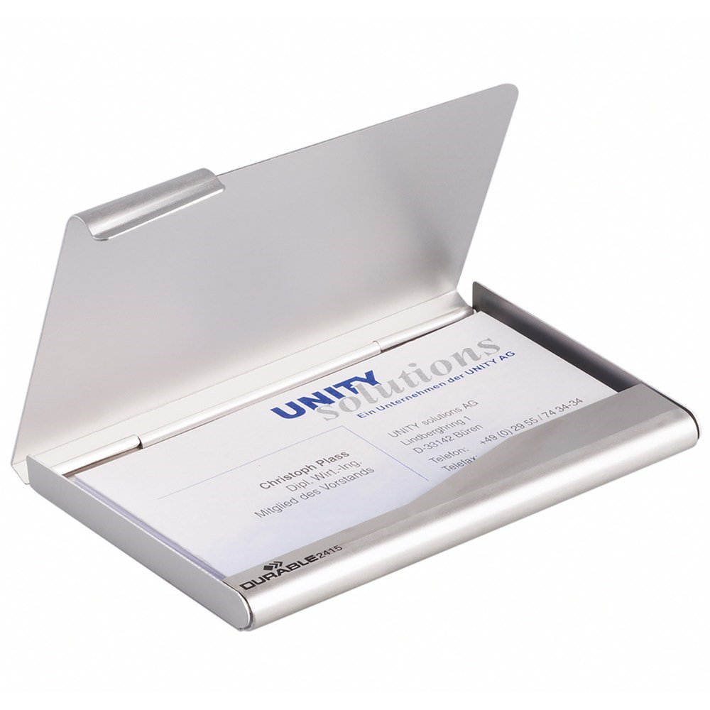 • Single slimline aluminium box holds up to 20 business cards.