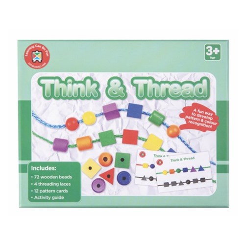• Includes: 72 wooden beads, 12 pattern cards, 4 threading laces and activity guide.