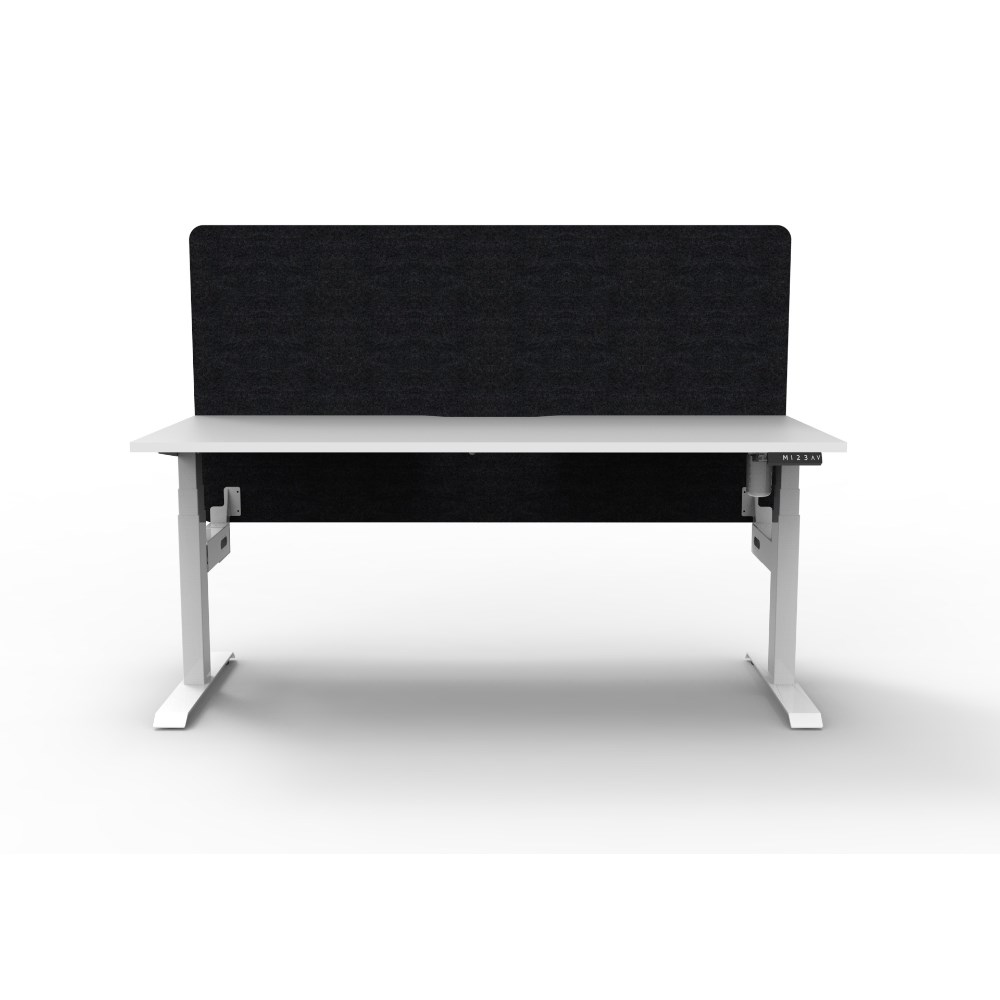 • Electric height adjustable single sided workstation with Natural White top and White Satin frame, Black Eco screen.