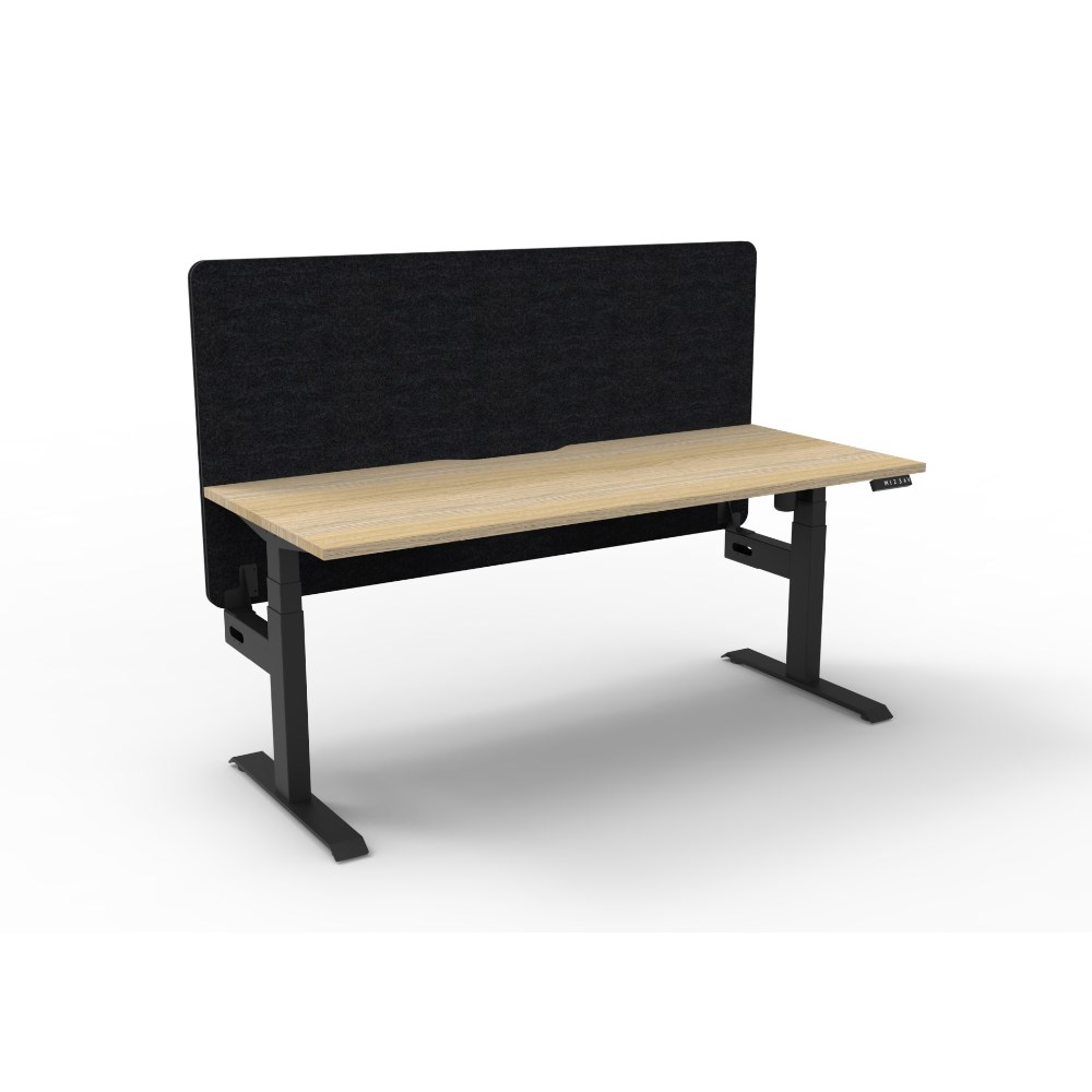 • Electric height adjustable single sided workstation with Natural Oak top and Black Satin frame, Black Eco screen.