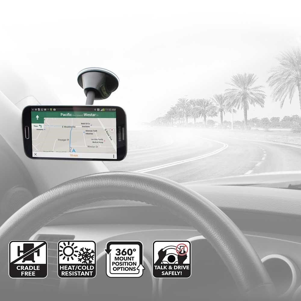 • StickGrip material on suction cup mount base plus automotive-grade adhesive mounting disk provides a strong, secure hold on dashboards, windows, countertops, desks, tables and other surfaces.