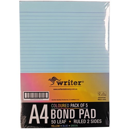 Writer A4 Premium Bond Pad 50 Sheet Ruled 2 Sides Assorted Pack Of 5
